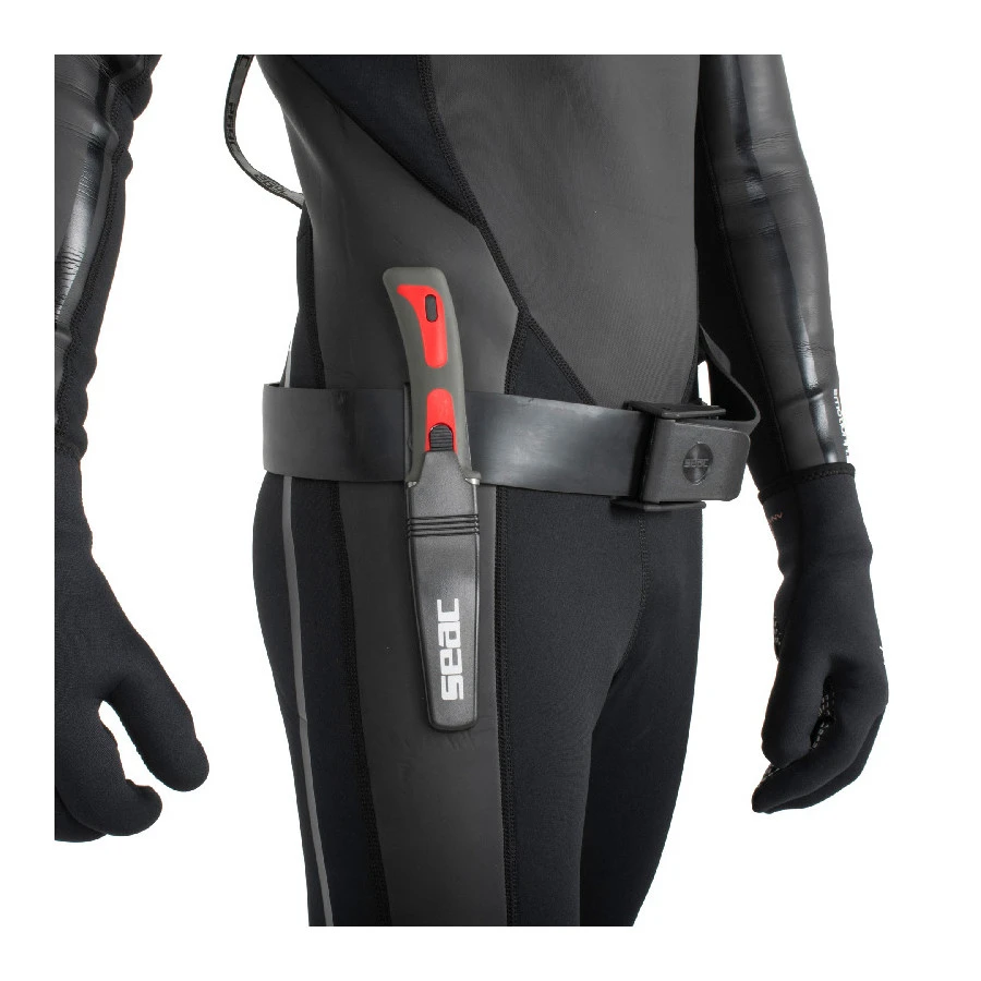 Seac Bat est un couteau de plongée avec une lame tranchante en acier inoxydable AISI 420 de 11,5 cm. Le côté courbé a une lame à fil droit, tandis que le côté droit est cranté et comprend un coupe ligne. Le manche est revêtu d’une couche qui en améliore la prise en main. Le fourreau du sac Seac Bat est rigide et peut être accroché au bras ou à l’avant-bras grâce aux sangles pratiques fournies. Le bouton de déverrouillage est intégré au manche. La longueur totale du sac Seac Bat est 23 cm. Attention ! Il est recommandé de toujours rincer à l’eau douce et de bien sécher avec du tissu ou du papier absorbant tant le couteau que le fourreau séparément et après chaque sortie, même si le couteau n’a pas été utilisé mais seulement porté, puisque le fourreau n’est pas étanche.