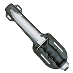 La lame de grandes dimensions, forgĂ©e dans un acier spĂ©cial, possĂšde un cĂŽtĂ© lisse et lâautre crantĂ© en scie.