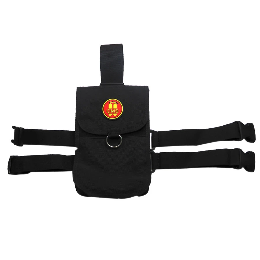 La poche est maintenue sur la cuisse par deux sangles réglables élastiques de 3,5 cm de hauteur, à boucle à clips rapide, et par une large sangle pouvant être passée à la ceinture de lestage ou à la ceinture ventrale du harnais pour un maintien total.