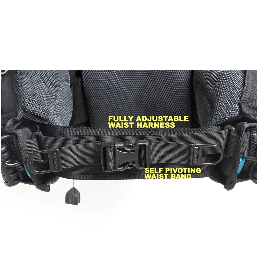 Le système de la sangle ventrale (en deux parties) utilise le nouveau système breveté SPWB (Self Pivoting Waist Band).