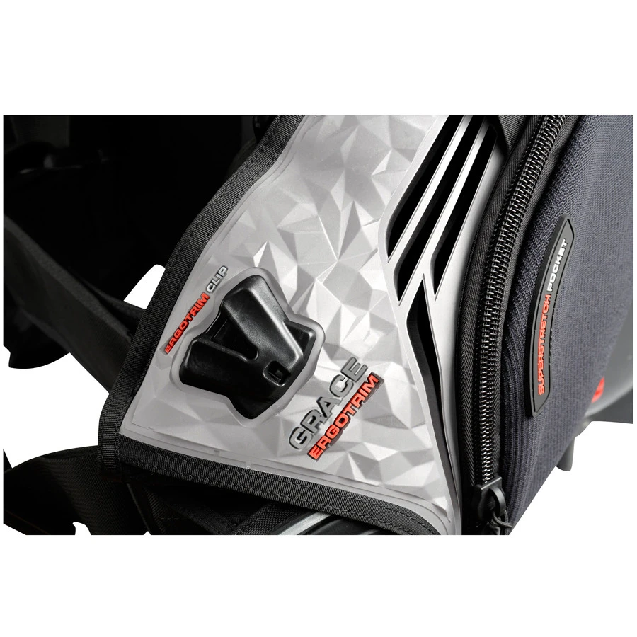 Le gilet de plongĂ©e sous-marine Grace Ergotrim, avec le nouveau système Airtrim 2.0, permet Ă la plongeuse de gonfler et dĂ©gonfler facilement sa stab quelle que soit sa position dans l’eau.