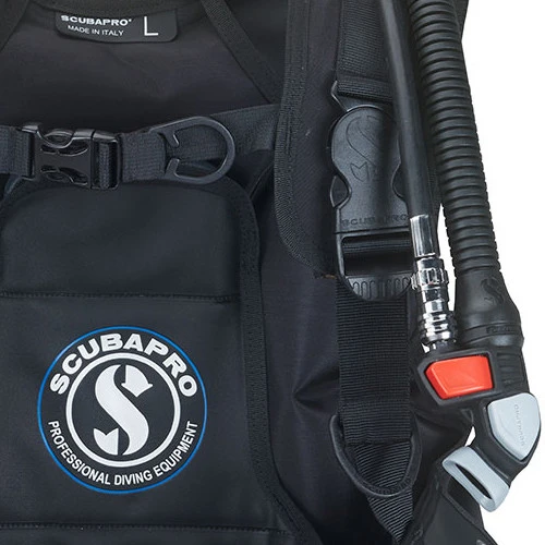 Deux grandes poches cargo sont également incluses. L’une d’elles est munie d’oeillets métalliques permettant la fixation d’un couteau, de quatre anneaux en D pour la fixation d’accessoires et de deux poches à Octopus pour le rangement d’un détendeur de secours et du flexible d’une console.